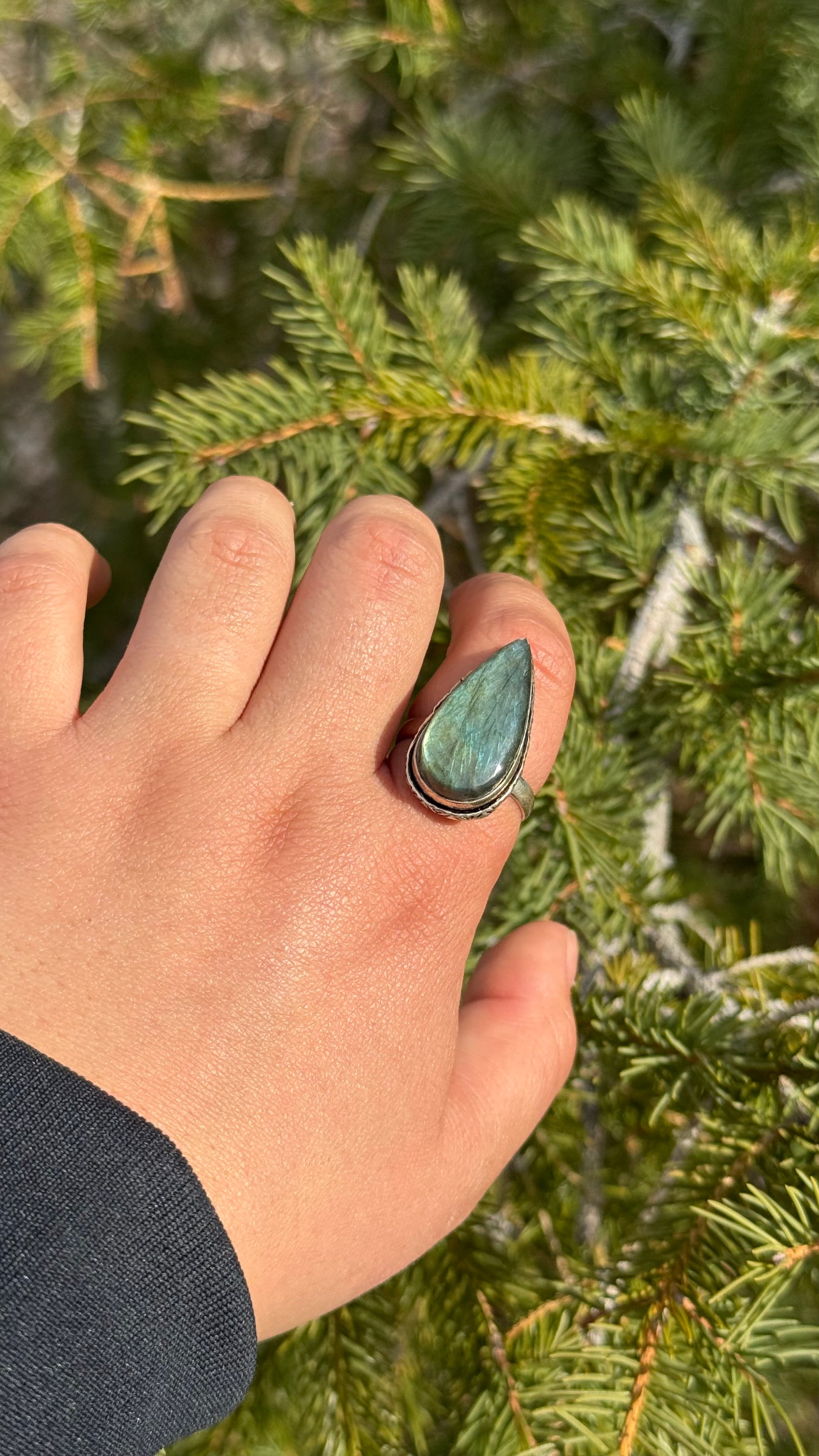 The Adjustable Labradorite ring features a durable, tarnish-resistant German silver band paired with a stunning labradorite stone. Its adjustable design allows for a custom fit, accommodating various finger sizes and ensuring comfort. This combination of materials and functionality offers both elegance and longevity in jewelry wear.